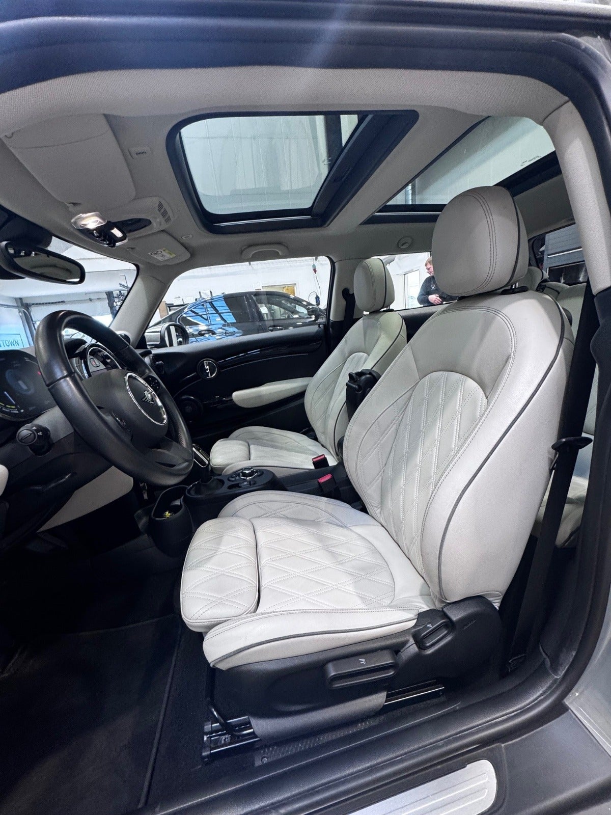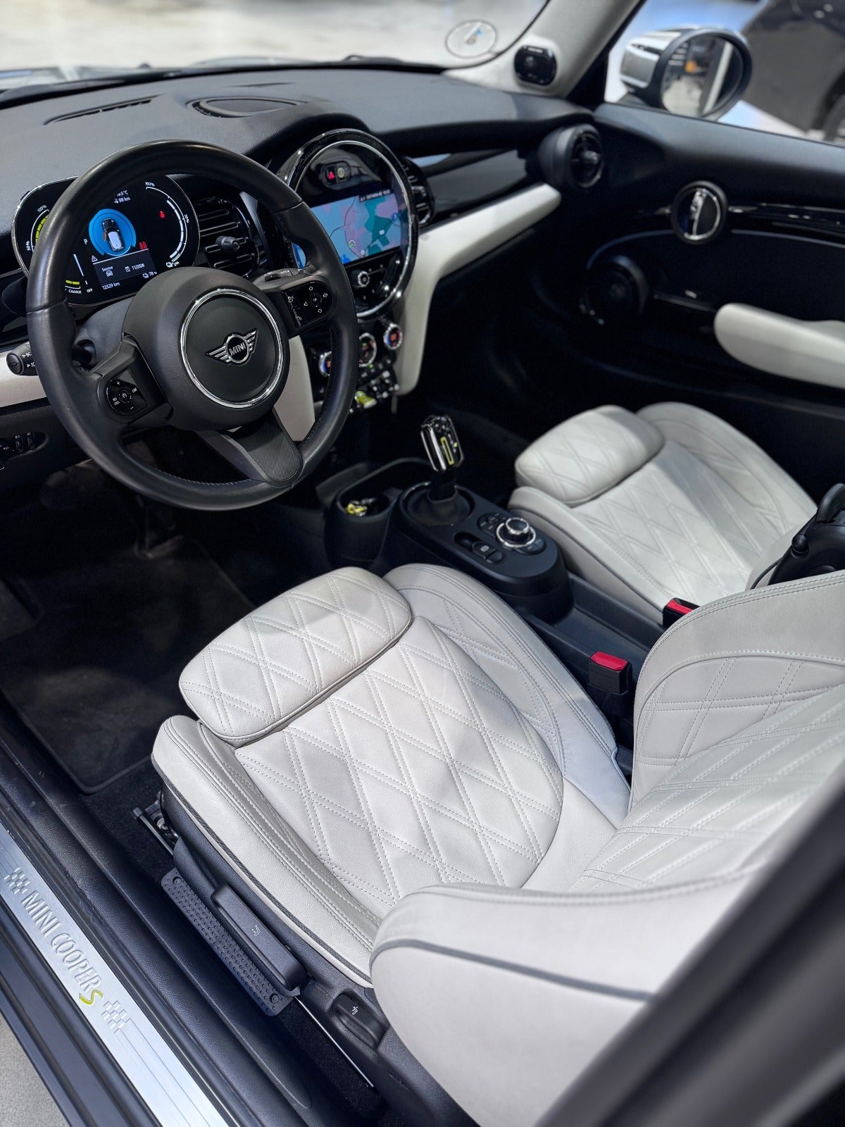 MINI COOPER SE MAXIMSE i Farven MOONWALK GREY med Piano Black Exterieur og Sportssæder Læder CHESTER SATTELITE ( Yours Trim ), Varmepumpe, PANORAMA GLASSOLTAG, Driving Assistant, Park Assistant, MINI Driving Modes, Fartpilot med bremsefunktion, HiFi højtalersys.Harman Kardon med musikstreaming via bluetooth, MINI Navigationsystem med Multifunctional instrument display, Apple carplay, Radio MINI Visual Boost med DAB radio, MINI Connected håndfrit til mobil, trådløs mobilopladning, LED Forlygter, MINI Lyspakke Udvendigt, Hvide Blinklys, Ambiente Interiør belysning, 2 zone klima, 16" Letmetal fælge Styling VICTORY Black ( 17" Som vist på billedet kan tilkøbes ), Sportslæderrat med multifunktion, kørecomputer, el-klapbare sidespejle m/varme, aut. nedbl. bakspejl, udv. temp. måler, Regnsensor, KOMFORT ADGANG nøglefri adgang, fjernb. centrallås, nøglefri tænding, digitalt cockpit, højdejust. forsæder, sædevarme, isofix, splitbagsæde, Tonede El-ruder, PARK ASSIST automatisk parkeringssystem, PDC Parkeringssensor (for & bag), Bakkamera, antispin, esp, automatisk nødbremsesystem - Mulighed For Finansiering via BMW Finans - RING FOR FREMVISNING